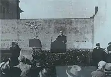 Heimerich's ideas were supported by the CDU and SPD. The CDU council and Nazi persecuted Florian Waldeck, said that before the majesty of death the political party barriers should fall. The KPD councillor Anette Langendorf, whose husband had been executed as a member of the Lechleiter group and who herself was imprisoned in the concentration camp, took a counterposition. Langendorf advocated a memorial for the victims of the war, but pointed out that among the victims of the war "there [were] people who went to war with great vigour and enthusiasm for Hitler and who wanted exactly the opposite of what resistance fighters voluntarily sacrificed their lives for".[7] The idea of a common memory caused considerable conflict among the people of Mannheim, especially the soldiers' associations.[6]