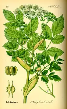 Angelica is a genus of about 90 species of tall biennial and perennial herbs in the family Apiaceae, native to temperate and subarctic regions of the Northern Hemisphere, reaching as far north as Iceland, Lapland, and Greenland.[2] They grow to 1–3 m (3 ft 3 in – 9 ft 10 in) tall, with large bipinnate leaves and large compound umbels of white or greenish-white flowers. Found mainly in China, its main use was for medicine. It shows variations in fruit anatomy, leaf morphology, and subterranean structures. The genes are extremely polymorphic.