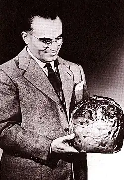 Motta's contribution to panettone was to create a distinctive high dome shape for his bread that replaced the older style of flatter panettone as the standard. His startling success saw his company expand considerably during the interwar years with Motta Foods introducing new bread including a celebratory Easter bread known as a Colomba di Pasqua, a dove-shaped yeast bread that uses panettone yeast but contains less fruit.[1] In many companies, panettone became the de rigueur holiday gift to give to staff. Top artists were commissioned by Motta to immortalize his bread in advertisements. Prices were slashed to attract yet more consumers.[2] It is estimated that panettone is now sold in seventy-five countries.