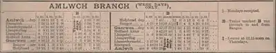 The autotrain introduced to serve this branch also operated on the Amlwch line: when not running to Red Wharf Bay the motor train would operate between Llangefni and Gaerwen while the main branch train was on the round trip from Llangefni to Amlwch and back.[30]
