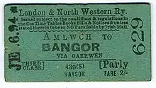 Under British Rail, many passenger services on the Amlwch branch operated through to Bangor, removing the need to change trains at Gaerwen.[39] An early three-coach British United Traction (A.E.C.) diesel multiple unit train was trialled on the line in May 1953. The train was economical in fuel use, and did not require a fireman, but train passengers and crew complained at the very rough ride - rattling windows a particular complaint. As part of British Rail's Modernisation Plan, Derby Lightweight DMUs were introduced three years later.[40] A 1956 brochure advertised day return tickets from Bangor to Amlwch for 4s.4d, or Llangefni for 11d.[41] Steam engines continued to be used for freight trains, and for extra workings such as Saturday trains. Steam returned for all passenger trains in the summers of 1963 and 1964 due to a shortage of DMUs.[40]