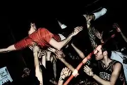A 2014 study indicates that vegan punks are more likely to remain politically active through their diets and lifestyles than those who do not belong to this subculture.[8] The majority of those incarcerated for illicit animal activism in the late 1990s and early 2000s were involved in hardcore punk music.[9] In the anglosphere, although women are probably the greatest part of animal rights and environmental advocacy, young white men constitute the majority of both eco-animal rights criminality and the "hypermasculine" vegan straight edge milieu, coinciding with the propaganda success of organisations such as the Earth Liberation Front.[10] Despite these correlations, the sociologists Will Boisseau and Jim Donaghey state that not all punks are vegans or are even interested in animal rights,[11] while sociologist Ross Haenfler writes that tolerant straight edgers have always outnumbered their militant counterparts, who, nevertheless, "overshadowed much of the scene" for their violent actions.[12]