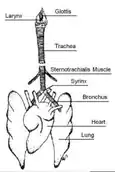 When birds inhale, air is passed from the mouth, through the trachea, which forks into two bronchii connecting to the lungs.[8] The primary vocal organ of birds is called the syrinx, which is located at the fork of the trachea, and is not present in mammals.[9] As air passes through the respiratory tract, the syrinx and the membranes within vibrate to produce sound.[10] Birds are capable of producing continuous song during both inhalation and exhalation, and may sing continuously for several minutes.[11] For example, the skylark (Alauda arvensis) is capable of producing non-stop song for up to one hour.[12] Some birds change their song characteristics during inhalation versus exhalation. The Brewer's sparrow (Spizella breweri) alternates between rapid trilling during exhalation interspersed with lower-rate trills during short inhalations.[13] The two halves of the syrinx connect to separate lungs, and can be controlled independently, allowing some birds to produce two separate notes simultaneously.[9]