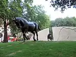 The memorial was inspired by Jilly Cooper's 1983 book Animals in War, and was made possible by a specially created fund of £1.4 million from public donations of which Cooper was a co-trustee. The memorial consists of a 55 ft by 58 ft (16.8 m by 17.7 m) curved Portland stone wall: the symbolic arena of war, emblazoned with images of various struggling animals, along with two heavily laden bronze mules progressing up the stairs of the monument, and a bronze horse and bronze dog beyond it looking into the distance.[1]