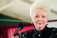 Richards' keynote address to the 1988 Democratic National Convention put her in the national spotlight. The speech was highly critical of the Reagan Administration and then-Vice President George H. W. Bush. Her address was notable for including several humorous remarks displaying her down-home Texas charm such as: "I'm delighted to be here with you this evening, because after listening to George Bush all these years, I figured you needed to know what a real Texas accent sounds like", "Poor George, he can't help it. He was born with a silver foot in his mouth",[3] "Two women in 160 years is about par for the course. But if you give us a chance, we can perform. After all, Ginger Rogers did everything that Fred Astaire did. She just did it backwards and in high heels",[4] and "When we pay billions for planes that won't fly, billions for tanks that won't fire, and billions for systems that won't work, that old dog won't hunt. And you don't have to be from Waco to know that when the Pentagon makes crooks rich and doesn't make America strong, that it's a bum deal". Richards' convention address has been cited by rhetorical experts as a historically significant speech.[5] In the presidential debate that year between Republican George Bush and Democrat Michael Dukakis, Bush referenced Richard's uncivil comments about him during her speech on his way to winning the White House.[6] The speech set the tone for Richards' political future. In 1989, with co-author Peter Knobler, she wrote her autobiography, Straight from the Heart: My Life in Politics and Other Places.