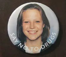 ![]() Anna Wood, depicted on a promotional badge for an anti-drugs campaign that her father organised following her death | |