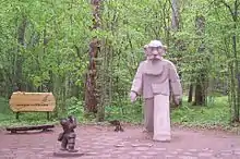 Sprīdītis playing the flute to make Lutausis dance (sculptures at Tērvete National Park)