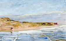 Gerresheim created mainly portraits and genre paintings during her years at the Berlin academy. She painted many landscape studies of the Baltic Sea after 1880, influenced by her stay in Hornbæk and the impact that the fisherman paintings of Peder Severin Krøyer and the seascapes of Kristian Zahrtmann had on her. In 1881 one of her paintings was shown at the Academic Art Exhibition in Berlin.[1] She participated from 1884 in the exhibitions of the Berlin Association of Women Artists and later was also a member of the Munich club for original etching. Gerresheim made primarily works with motifs of the Baltic coast during her time in Ahrenshoop. She was still active there after 1918 when many artists left the village.