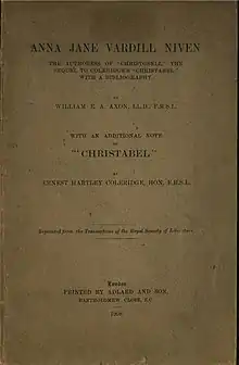 Anna Jane Vardill became Anna Niven and wrote as "V" (19 November 1781 – 4 June 1852) was a British poet. She created a mystery when she published a sequel to one of Coleridge's poems before he had published his work. It was claimed that Vardill's poem was not hers but later evidence discovered after her death that this was her poem. There is a Vardill Society that is gathering her forty years of publications together.