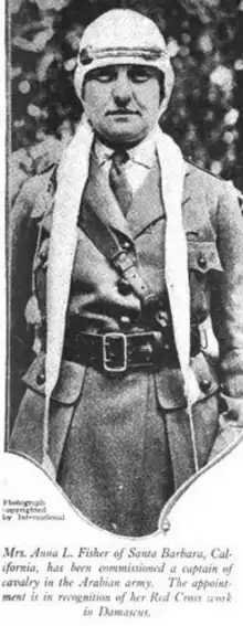 During World War I, Fisher joined the Red Cross to do relief work in France, and later moved to working in Damascus. In 1919, she held the rank of captain in the Syrian army.[9] She was described as "unofficial ruler of the Arab Kingdom of Syria", in reference to her role as advisor to Faisal I of Iraq. She organized schools, encouraged the development of traditional handicrafts,[10] and ran the American Red Cross orphanage in Damascus.[11]