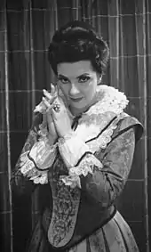 Moffo was also invited to sing at the San Francisco Opera where she made her debut as Amina on October 1, 1960. During that period she also made several appearances on American television, while enjoying a successful international career singing at most major opera houses around the world (Stockholm, Berlin, Monte Carlo, Mexico City, Buenos Aires, etc.). At the Metropolitan Opera in March 1961 with Birgit Nilsson and Franco Corelli she performed in Turandot as Liù, conducted by Leopold Stokowski.[4] She made her debut at the Royal Opera House in London, as Gilda, in a Franco Zeffirelli production of Rigoletto. Shortly after the Italian tenor Sergio Franchi joined RCA Victor, they recorded a popular album of operetta duets, The Dream Duet, which peaked at number ninety seven on the Billboard 200 in 1963.[5] Later that year Franchi and Moffo collaborated in recording excerpts from Die Fledermaus with the Vienna State Orchestra and Chorus conducted by Oskar Danon. In 1999 this album was re-mastered and re-issued in High Performance Stereo.[6]