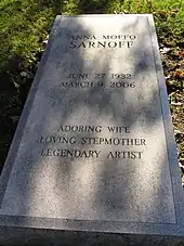 Anna Moffo spent the last years of her life in New York City, where she died in 2006 of a stroke at age 73, following a decade-long battle with breast cancer.[4] She is interred with Sarnoff at Kensico Cemetery, Valhalla, New York.