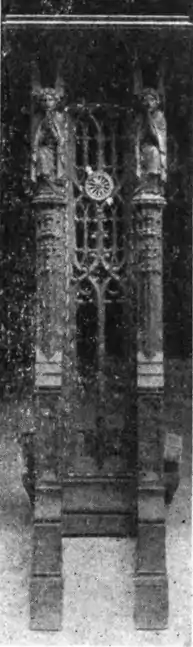 The Prayer Desk was the gift of the Valley Forge Chapter, D.A.R. to the Washington Memorial Chapel, in memory of Holstein, its first Regent and Founder. It was dedicated June 19, 1916. The inscription was cut in brass and inlaid with pewter, and bears the arms of Washington, the Washington Memorial Chapel, the Diocese of Pennsylvania, and the insignia of the D.A.R.[10]