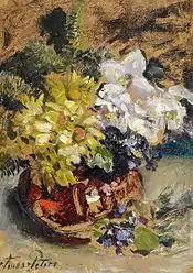 Peters was the first woman in Germany who was able to make a living from the sale of her paintings.[7] During the summer months she regularly visited Schloss Köngen to the southeast of Stuttgart, where she and her sisters had a studio where they were able to develop their artistic skills. Her works include drawings, watercolours and oil paintings—her first known picture dates to 1860. Peters began to produce flower paintings and village landscapes. In Schloss Köngen, she met Christian Mali and his artist friend Anton Braith.[7] The focus of her work continued to be mainly paintings of flowers and plants in the traditional Dutch century style. They frequently consisted on bouquets with grasses and twigs, occasionally with insects. She produced several landscapes, a few pictures of children, and added decorations to royal castles at Stuttgart and Friedrichshafen. She won medals for her work in 1873, 1874, 1876, and 1877.[5] In the late 1890s, her style became increasingly impressionistic. She regularly took part in exhibitions after 1896 in Berlin, Munich, Dresden and Vienna. In 1900 she produced a painting of Schloss Köngen itself.[7]