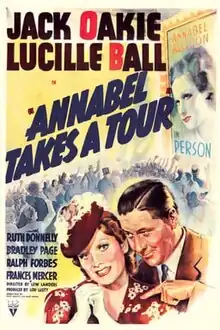 Annabel Takes a Tour is a 1938 American comedy film directed by Lew Landers and starring Lucille Ball, Jack Oakie and Ruth Donnelly. Annabel (Lucille Ball) is on a promotional tour and, as a publicity stunt, leaks a story that she is having a romantic fling with a famous romance novelist.[1] The film is a sequel to The Affairs of Annabel.
