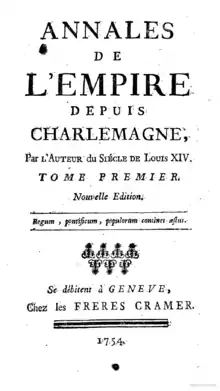 Annals of the Empire (Annales de l’Empire) is a history of Germany written by the French philosopher and author Voltaire at the request of Princess Luise Dorothea of Saxe-Meiningen in 1753. The first volume appeared in December 1753 and the second in March 1754.[1]