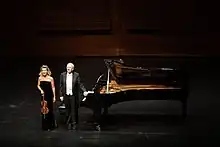 Mutter performed classical and contemporary works during the 2010s, touring Europe, North America, Asia, South America, and Australia. For her yearly tours and performances, she continued her collaborations with Lambert Orkis and performed the major concertos of the classical repertoire.[52][53][54][55][56] She premiered Wolfgang Rihm's "Lichtes Spiel" with the New York Philharmonic and "Dyade" with double bass player Roman Patkoló in 2010 and Sebastian Currier's "Time Machines" with the New York Philharmonic conducted by Alan Gilbert in 2011 to critical acclaim.[57][58]