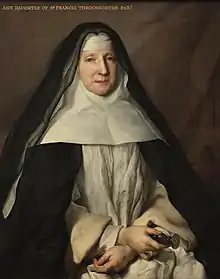 She began her education English Blue Nuns in the rue de Charenton in Paris. She was there for five years before her mother joined her. Her mother had separated from her husband in 1677 and she came to spend the rest of her life with the Blue Nuns.[2] Anne (the daughter) professed as an Augustinian nun at another convent on the outskirts of Paris on 2 July 1687. This Augustinian Convent of Our Lady of Syon had been founded by English expatriate Catholics in 1634.[3]
