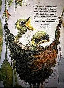 Annemieke Mein (born in 1944 at Haarlem) is a Dutch-born Australian textile artist who specialises in depicting wildlife. She was the first textile artist to be member of Wildlife Art Society of Australasia and the Australian Guild of Realist Artists. The subjects of her sculpted textiles are birds, frogs, gum and wattle blossoms, and insects such as moths, dragonflies, wasps and grasshoppers. Her fondness for insects and her sympathetic images, often greatly enlarged and showing normally invisible colours and textures, have revealed new aspects of the everyday world.