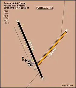 Annette Island Airport (IATA: ANN, ICAO: PANT, FAA LID: ANN) is located on Annette Island in the Prince of Wales – Hyder Census Area of the U.S. state of Alaska.[1] It is located 5 nautical miles (9 km) south of Metlakatla, Alaska.[2] The airport was established as the Annette Island Army Airfield during World War II and initially served as a military airbase.