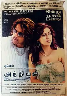 Anniyan (transl. Stranger) is a 2005 Indian Tamil-language psychological action thriller film written and directed by S. Shankar and produced by V. Ravichandran of Aascar Films. The plot centres on a disillusioned everyman whose frustration at what he sees as increasing social apathy and public negligence leads to a split personality that attempts to improve the system. Vikram stars as Ambi, an idealistic, law-abiding lawyer who has Dissociative identity disorder (formerly known as Multiple personality disorder) and develops two other identities: a suave fashion model named Remo and a murderous vigilante named Anniyan. Sadha plays the female lead role. Actors Vivek, Nedumudi Venu, Nassar and Prakash Raj also featured in the film.