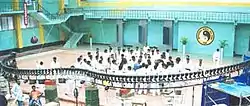 In a fight sequence, Anniyan encounters about a hundred martial artists inside the fictional International Martial Arts School, Vodao.[77] The stunt scene was shot at the JJ Indoor Stadium in Chennai over a period of 25 days.[78][79] Peter Hein, the stunt choreographer, is a native of Vietnam. 127 professionally trained fighters were brought in from Vietnam for the shoot.[79][80] During the rehearsals, the rope, to which the stuntmen were tied and hung upside down, gave in.[78] About a dozen stuntmen crashed down from the balcony, injuring themselves badly.[81] The action sequence was shot using 120 cameras for employing the time slice photography technique, a visual effect known as "bullet time" and popularised by the American film The Matrix (1999), to achieve the frozen-time effect.[15] Shankar had earlier toyed with the idea of time-slice and tried it while filming the song "Ale Ale" in his Boys.[82] While the time-freeze sequence in Boys was achieved by the linking of 60–62 cameras to attain a 180° rotation, Anniyan employed 120–122 cameras for a 270° rotation.[83][84]