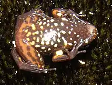 Males measure 20.4–22.4 mm (0.80–0.88 in) and females, based on the only known specimen, 23.4 mm (0.92 in) in snout–vent length. The head is slightly longer than it is wide. The tympanum is barely visible in some specimens but distinct in others. Skin is shagreened. The dorsum is chocolate brown and patternless apart from small irregular dark brown spots. The upper lip has four small irregular white spots. The ventrum has dark brown background with white or whitish spots and small dark spots.[4]