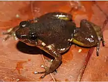 The only adult male in the type series measures 20 mm (0.8 in), whereas three adult females are slightly larger, 21–22 mm (0.8–0.9 in) in snout–vent length. The snout sloping, pointed in profile, and nearly truncate in both dorsal and ventral profile. The tympanum is distinct but partly concealed by the supratympanic fold. The fingers bear small terminal discs and keel-like fringes. The toes have fringes and are partially webbed. Dorsal coloration is dark brown, with black flanks and a white, oblique lateral stripe. There is a bright white spot below tympanic area. The axilla is white. Throat, chest and belly yellowish, lower arms, and hind limbs are greyish. Some finger discs are white. The upper lip is dirty white. The iris is bronze.[3]