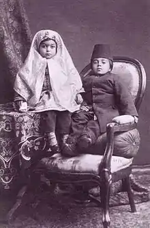 Anoushiravan Mirza also written Anushirvan Mirza was born on 19 August 1833 at Ardabil, Iran, and died on 23 October 1899 in Tabriz after developing apoplexy and paralysis. He was at Shusha, Karabakh. He was the first-born and eldest son of Prince Bahman Mirza, the governor-general (vali) of Azerbaijan in the time of Mohammad Shah Qajar. His mother was Bahman Mirza's first chief wife Princess Malek Soltan Khanom, daughter of Prince Mohammad Taghi Mirza "Hessam os-Saltaneh".[1][2] After Bahman Mirza fell out of favour at court in Tehran and exiled to Russia in 1848 his wives and children followed him to Russian occupied Caucasus province of Karabakh. But shortly after 1850 Anoushiravan Mirza moved back to Iran. And when his cousin Nasser al-Din Shah pardoned Bahman Mirza in 1872, finally Anoushiravan Mirza was rewarded with several governmental offices. In 1873 he became governor of Turshiz, 1878 governor of Talesh, later 1881-1882 governor of Tabriz, 1884-1886 and 1898-1899 of Semnan, Damghan and Shahrud, 1888-1889 governor of Borujerd and Lorestan. In 1891 he had the vizierate of the province of Kermanshah on behalf of the almighty governor and commander-in-chief of his time Hassan Ali Khan Garrousi "Amir Nezam". He also received the title of Zia' od-Dowleh (lit. Splendour of the State) - which that he became well-known - and the military rank of Amir Touman (lit. Commander of Ten Thousand, i.e. general) by Nasser al-Din Shah.[3]