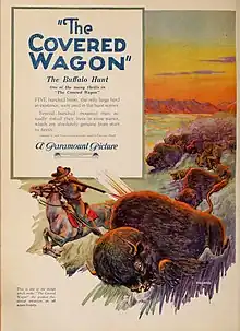 One of the early silent movies of the twentieth century, The Covered Wagon, was partly filmed on Antelope Island, where a scene requiring a buffalo hunt and a stampede were needed. At the time the herd on Antelope Island was possibly the largest herd of bison in the United States. After much effort, about 350 of the animals were herded into a stampede and it was caught on this early film. The movie is considered by some people to be the first great Western epic and it established some of the clichés that persist in Western movies, such as circling the wagons in time of danger or attacks. During the movie, seven buffalo were shot and killed for the hunting scenes. "Don't grow sentimental over the seven," said James Cruze, the director of the film. "The folks out there would like to get rid of the whole herd and they would, but for the sentimental hubbub that is always raised when they talk of rounding out the buffalo. The animals are worthless - there isn't worse meat on earth to eat - and they ruin the whole territory for cattle grazing purposes. So the buffalo remain - sentimental reminders of the America of the past."[6]