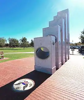 The memorial's five white pillars represent the nation's military branches and are arranged in Department of Defense order of precedence: Army, Marine Corps, Navy, Air Force, and Coast Guard. Each pillar has an elliptical opening that slants downward toward the Great Seal of the United States. On Veterans Day – November 11 – the design allows the sun's rays to spotlight the Great Seal at 11:11 am Mountain Standard Time. The design goal was 11:11:11 am, but the variations each year cause the precise alignment over the next 100 years to be between 11:10:58 and 11:11:22.[1]