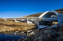 Overall, the project included the construction of nine interchanges, two road flyovers, eight rail flyovers, and twin bridges over the North Saskatchewan River for a total of 47 bridge structures,[56] and the demolition of 13 existing bridges.[19] An extensive environmental assessment was also completed which identified the need for a wildlife crossing at the river, which was constructed. Noise analysis based on projected traffic volumes was also completed.[12]: 211 The complex interchange at Yellowhead Trail includes several braided ramps, connections to adjacent roads, and is bisected by a railway line.[7] On October 1, 2016, the northeast leg of the freeway was officially opened to traffic.[60]