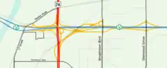 Anthony Henday Drive features several variations of the combination interchange, a common name for hybrid designs that allow for high speed left turns on elevated or depressed directional ramps.[7] They retain loop ramps for the lesser used left turn movements which significantly reduced the cost and overall size of the interchange because fourth level flyovers are not required as they are in a stack interchange.[23] Henday features two three-level interchanges; the one at Calgary Trail / Gateway Boulevard was the first three-level interchange to be constructed in Alberta.[24] Several of the bridges in this interchange use a "Trellis Beam" concept in which many perpendicular girders are used to carry the upper roadway at a high degree of skew.[24][25] Anthony Henday Drive's junction with the Yellowhead Highway east of Edmonton was reconstructed with two new two semi-directional flyovers and one loop ramp for the eastbound to northbound movement. The existing semi-directional ramp for the westbound to southbound movement that runs parallel to the railway line that bisects the interchange, which opened prior to the completion of the northeast leg of Anthony Henday Drive, has been retained in the reconfigured interchange. [7]