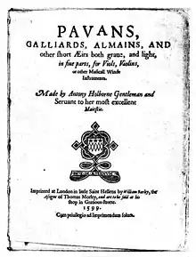 An "Anthony Holburne" entered Pembroke College, Cambridge in 1562,[1] and it is possible that this person is the same as the composer. A Londoner of the same name was admitted to the Inner Temple Court in 1565, and again this may have been the same person. It is certain, however, that the composer was the brother of William Holborne, and that he married Elisabeth Marten on 14 June 1584.[2] On the title page of both his books he claims to be in the service of Queen Elizabeth. He died of a "cold" in November 1602.