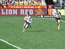 After scoring 16 tries during the 2002 NRL season, Minichiello played on the wing for the Roosters in their 2002 NRL Grand Final win over the New Zealand Warriors. He was also part of the successful Roosters team that took out the 2003 World Club Challenge against 2002 Super League champions, St. Helens. With Mini playing fullback, the Roosters easily accounted for Saints 38–0 at the Reebok Stadium in Bolton, England in front of 19,807 fans. For the first three seasons of his career Mini played on the wing for the Roosters, but the retirement of Luke Phillips following the 2002 NRL Grand Final prompted then-Roosters coach Ricky Stuart to move Minichiello to fullback.[10] His move to fullback coincided with some of the Roosters' best football for the early part of the new millennium. It also saw him become an almost automatic selection for both NSW and Australia for the next few seasons. With the help of the recently New Zealand former Warriors fullback and newly appointed Roosters Premier League coach Ivan Cleary, Mini would become a vital part of the Roosters attack.[10] His great performance in his new position soon paid off with selection for City in the 2003 City vs Country Origin match and for New South Wales in the 2003 State of Origin series, and went on to play in his 100th NRL game for the Roosters in the first Preliminary Final of the 2003 NRL Finals Series.[11] He was declared Man of the Match in the Roosters 28–18 victory over the Bulldogs.[12] The Roosters subsequently lost the 2003 NRL Grand Final to the Penrith Panthers, in which Minichiello played at fullback.[13] Minichiello ran 4,571 metres with the ball in 2003, more than any other player in the competition.[14] After that he was selected to go on the successful 2003 Kangaroo tour in which Australia defeated their oldest rivals Great Britain 3–0 to retain The Ashes. Mini played on the wing for the Kangaroos in all three tests due to the presence of Brisbane Broncos fullback Darren Lockyer, who was also the captain of the Kangaroos.