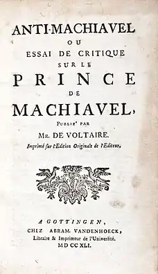Anti-Machiavel is an 18th-century essay by Frederick the Great, King of Prussia and patron of Voltaire, consisting of a chapter-by-chapter rebuttal of The Prince, the 16th-century book by Niccolò Machiavelli. It was first published in September 1740, a few months after Frederick became king.[1]