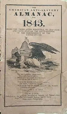 The American Anti-Slavery Almanac was published yearly from 1836 to 1843 by the American Anti-Slavery Society, as one of the Society's efforts to raise awareness of the realities of slavery in nineteenth century America.[1] The yearly almanac compiled calendars and astronomical data with anti-slavery literature, art, and advertisements.[2] in a small, neat pamphlet. For instance, the 1843 edition included works from authors such as William Lloyd Garrison and Thomas Moore as well as accounts of recent slave rebellions and quotes from political speeches supporting the abolition of slavery.[3] The almanac did not call for uprising or violence, but rather served as a means to spread the word about the anti-slavery cause.[4][5][6][7][8]