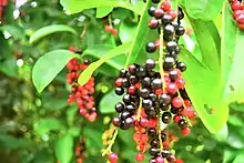 The species is dioecious, with male and female flowers growing on separate trees. The flowers have a strong, somewhat unpleasant scent. The staminate flowers are arranged in small bunches and the pistillate flowers grow on long racemes which will become the long strands of fruit. The fruits are spherical and just under 1 cm (1โ2 in) wide, hanging singly or paired in long, heavy bunches. They are white when immature and gradually turn red, then black.