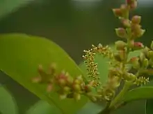 The taxa can grow as a shrub or a small tree, from 2m up to 20m high,[4] in Australia often with a short, poorly-formed trunk/bole.[5] Dark-coloured bark. Leaves are some 3-7 by 3–5 cm in size (sometimes as short as 2 cm or as long as 16 cm, as narrow as 2 cm and as wide as 9 cm), with curving lateral veins (but these do not form distinct loops inside the margin), oblong blade (occasionally ovate or obovate); pale twig lenticels; pubescent, filiform stipules; tufts of hair/domatia present; leaves dry to olive-green to reddish-green. Its flowers emerge at the axils or on the tip of branches. Male flowers have 4–5 stamens with u-shaped anthers, while female flowers have ovaries covered with soft hairs.[6] Yellow-green flowers,[7] some 1mm in diameter with pubescent disc, these are for both male and female flowers. Small fruit, only 4-5mm long with a persistent calyx that is not disc-like. Seed germination occurs in 28–9 days. There are elliptic cotyledons, some 8 by 5mm. At tenth leaf stage there are hairy petioles and hairy, filiform stipules (1-2mm long). In Western Australia, flowering occurs from August to December.[7] In Thailand, flowering and fruiting is all year round.[8] In Zhōngguó/China, flowering is from March to September, while fruiting is from June to December.