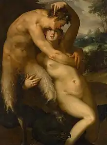 Her beauty attracted Zeus, who, assuming the form of a satyr, rapes her.[4] A.B. Cook noted that her myth "took on a Dionysiac colouring, Antiope being represented as a Maenad and Zeus as a Satyr".[5] This is the sole mythic episode in which Zeus transforms into a satyr. Being pregnant with Zeus's child, Antiope feared the wrath of her father, Nycteus, and fled to Sicyon, where she married Epopeus.[6] After this she was carried off by Epopeus, who was venerated as a hero in Sicyon;[7] he would not give her up till compelled by her uncle Lycus.[8] Lycus pursued Antiope after his brother Nycteus committed suicide because of Antiope's disgrace.[6]