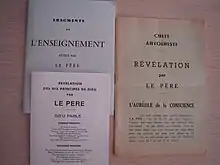 The Antoinist literature is mainly composed of Antoine's writings, which are considered as sacred by followers and should not be modified.[159] They include three doctrinal books grouped into two volumes which are sold in the temples and read during the worship: Revelation of the Father (La Révélation par le Père), The Coronation of the Revealed Work (Le Couronnement de l'Œuvre révélée) and Development of the Teaching of Father (Le Développement de l'Enseignement du Père). According to Debouxhtay, "the writings of Antoine do not shine by their qualities of style", a view shared by other observers.[160] Many statements from the Antoines are gathered into 14 books called Tomes, which remain only accessible to dressed members. From May 1907 to April 1909, the religion published the journal The Halo of Consciousness,[58] then from September 1911 to August 1914, The Unitive.[161] In 1936, Belgian writer Robert Vivier published a hagiographic biography—although based on real facts—of Louis Antoine, which is also used by Antoinists to strengthen their faith,[162][163] and thus sold in the temples.[164]