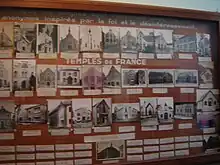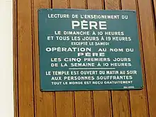 The exterior facade displays an architecture which can be variable according to the temples, but always includes the words "Antoinist Worship" ("Culte Antoiniste") and the year of the building consecration. At the entrance, there is a porch where various writings of the religious movement, the internal regulations (in France only), the list of the places of worship and the holidays, as well as photos of the Antoine couple and of the various temples, are exhibited behind display windows.[153]