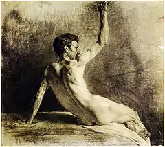Ažbe, himself a master of human anatomy, enforced rigorous training in this subject, from nude figure drawing to attending autopsies.[33] Igor Grabar, who approved this approach, recalled that in the process he memorized all human muscles and bones by heart to the point where he easily reproduced them in plaster with closed eyes.[33] Wassily Kandinsky, on the contrary, dreaded figure drawing sessions: "I quickly encountered a constraint upon my freedom that turned me into a slave, even only temporarily in a new guise – studying from a model. Two or three models 'sat for heads' or 'posed nude'. Students of both sexes and from various countries thronged around these smelly, apathetic, expressionless, characterless natural phenomena who were paid fifty to seventy pfennig an hour... the people who were of no concern to them... they spent not one second thinking about art."[36]