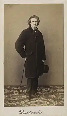 Born in Meissen, Dietrich joined the Dresden Academy of Fine Arts at age 14 and studied sculpture under Ernst Julius Hähnel. In 1848 he made his debut at an exhibition held by the academy. He became a student of the painter Eduard Bendemann in that same year, but a short time later Dietrich moved, together with Leonhard Gey, to work in the studios of Julius Schnorr von Carolsfeld. Despite positive reviews, Dietrich was unable to make a living as a freelance artist, so he also worked as an illustrator for various publishers and art dealers.