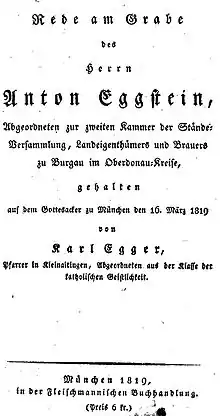 - Carl Borromäus Egger: Rede am Grabe des Herrn Anton Eggstein, Abgeordneten zur zweiten Kammer der Stände-Versammlung, Landeigenthümers und Brauers zu Burgau im Oberdonau-Kreise: Gehalten auf dem Gottesacker zu München den 16. März 1819, Digital copy