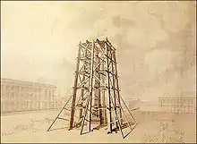 Adamini also designed a monument to the Battle of Borodino on the road to Smolensk.[2] In 1835, Nicholas I of Russia ordered to install 16 standard cast-iron monuments in the places of the most important battles of the Patriotic War of 1812. The monuments were divided into three classes: the first class monument was to be installed in Borodino, the second class monuments in Tarutino, Maloyaroslavets, Krasnoye, Studenka (at the Berezina), Klyastitsy (near Vitebsk), Smolensk, Polotsk, Chashniki, Kulakovo and Kovno, the third class monuments - in Saltykovka (east and outside Moscow), Vitebsk, Kobrin, Vyazma. The place of installation of the 16th monument is absent in the documents. However, this plan was not fully realized. The first monuments were installed in Borodino, Smolensk and Kovno, then there were monuments in Maloyaroslavets and Krasny. But at the beginning of 1848 it became clear that the rest of the monuments lacked funds, and the program of installation of monuments had to be curtailed. Only two more monuments of the second class, already cast by that time, were installed - in Polotsk and Klyastitsy. Thus, seven of the planned sixteen monuments were installed.