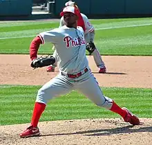 After Brett Myers tore his labrum and placed on the 15-day disabled list, the Philadelphia Phillies called up Bastardo on June 2, 2009.[11][12] He won in his first start against the Padres, allowing only one earned run during his six innings pitched.[13][14] After his Phillies' debut, Bastardo recorded a 2–3 record with a 6.75 ERA and 19 strikeouts. On June 25, during a start against the Tampa Bay Rays he suffered a shoulder injury[15] that forced him to go on the disabled list.[16][17][18] He returned to the Phillies roster for the postseason, where he made a relief appearance in the second game of the National League Division Series against the Colorado Rockies, striking out Jason Giambi with two outs and the bases loaded.[19]