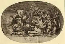 Although there is no certain proof, most scholars have agreed that there was a printmaking workshop at the Palace of Fontainebleau itself, reproducing the designs of the artists for their works in the palace, as well as other compositions they produced, and copying from drawings by other masters brought from Italy, probably mainly by Primaticcio.[22] The most productive printmakers were Davent, Fantuzzi, and Jean Mignon, followed by the "mysterious" artist known from his monogram as "Master I♀V" (♀ being the alchemical symbol for copper, from which the printing plates were made).[23] The workshop seems to have been active between about 1542 and 1548 at the latest; Francis I of France died in March 1547, after which funding for the palace wound down, and the school dispersed. Hundreds of etchings were produced;[24] these were the first etchings made in France, and not far behind the first Italian uses of the technique, which originated in Germany.[25] The earliest impressions of all the Fontainebleau prints are in brown ink, and their intention seems to have been essentially reproductive.[26]