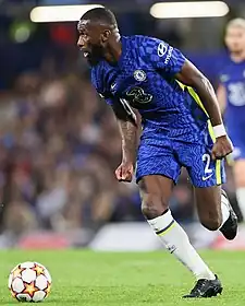 On 9 July 2017, Rüdiger joined Chelsea from Roma for a reported initial fee of £29 million on a five-year deal.[17] He was given the number 2 shirt.[18] He made his debut on 6 August as a substitute replacing Marcos Alonso in the 79th minute in a 4–1 loss on penalties to Arsenal in the 2017 FA Community Shield.[19] He made his Premier League debut six days later in a 3–2 defeat against Burnley at Stamford Bridge.[20] He scored his first goal for Chelsea in the round of 16 of the EFL Cup in a 2–1 win over Everton,[21] and his first league goal was the only one of a home win over Swansea City on 29 November 2017.[22] On 20 October 2018, Rüdiger scored his first goal of the season, opening the scoring in a 2–2 home draw against Manchester United.[23]