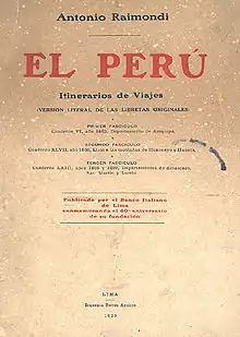 Throughout his career, Raimondi displayed a passion for all things Peruvian. He undertook no less than 18 extensive journeys to all regions of the country, studying the nation's geography, geology, botany, zoology, ethnography, and archaeology. In 1875, he collected his findings in the massive tome El Perú, which was subsequently republished in numerous editions over the next 40 years. The Raimondi Museum in Lima houses some of the collections he gathered in his travels.